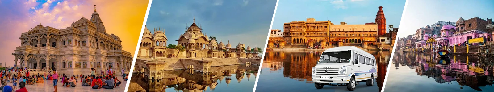 If you are planning a trip to Vrindavan and Mathura with family or friends, book luxury tempo traveller from Delhi to Mathura Vrindavan and get unlimited advantages of tempo traveller hire from best tempo traveller rental company in Delhi. All our tempo travellers are driven by experienced driver who can guide you in better way to explore the city and hidden attractions. Get premium facilities and amenities at economical price as we follow transparent billing process. We ensure safety and follow all guidelines to drive in a hilly area or northern plains. Tempo travellers equipped with GPS and Wi-fi keep passengers connected and safe. We keep customers safety at top priority, so our drivers never ride the vehicle over the speed limit. Book Maharaja tempo traveller for enhanced comfort and travel in luxury from Delhi to Vrindavan. Book 9 seater, 12 seater tempo traveller in Delhi, 16 seater luxury van equipped with comfortable pushback seats, adequate luggage space, modified interior design, separate AC vents, charging points, Wi-Fi, GPS, ice box, water bottles and first aid box. Contact us for Delhi to Mathura group tour plan and frequent cab bookings for temple tour and complete sightseeing in Mathura with fixed departure.